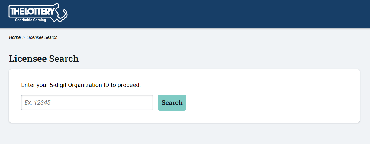 Next, enter your 5-digit or 6-digit Organization ID in order to proceed. Please contact the Charitable Gaming office at (781) 849-5527 if you do not know your Organization ID and they can provide further assistance.
